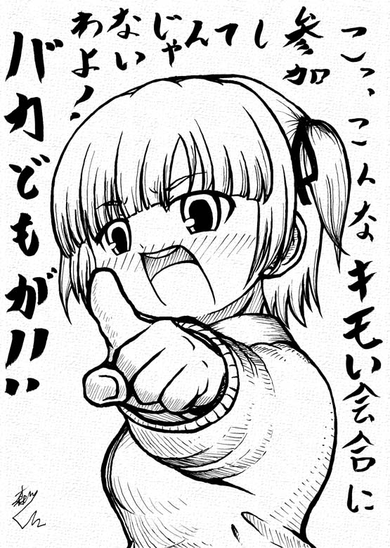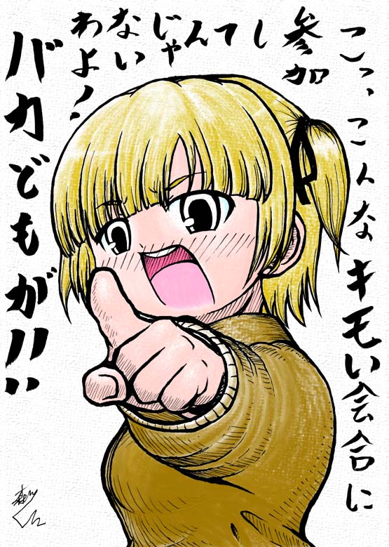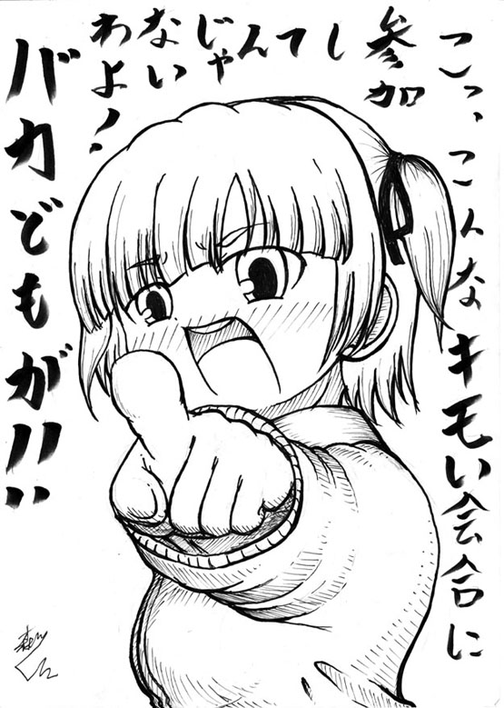 「一枚の絵を仕上げ完成させていくまでの様子を、過程ごとに逐一発表してレポートする」 というものを自分もやってみたいと思います。 ・・・というワケで今回の題材は、 先月自分が参加した新年会の時に描いたこちらのイラスト。 何やらいきなりケンカを売っていますが気にせずにいきましょう。他に丁度良い絵もネタも無いし(ヲイ。 (にしても、あくまでもネタとはいえ、我ながら何という無礼なイラスト・・・(;゚∀゚)) (ちなみに今回のこの絵、元々は新年会の時に自分がマスカワ氏に差し上げ、後にマスカワ氏が「もしカラーで仕上げたくなったら」と気を配って300dpiでスキャニングして私に送ってくれたものなのです。 このテの企画の場合、大抵は“真っさらな用紙の上にラフやアタリを描き始める”ところから始めるものなのですが、今回はマスカワ氏の心配りに応えるべく、このペン画を企画に採用させていただきました。 マスカワ様、改めてお礼申し上げます_| ̄|○) ・・・というワケで、 みつどもえファンなら知らぬ人などいないこの 雌豚のペン画に色を塗り、完成させるまでの様子を少しずつレポートしていきたいと思います。 では、まずは線画のゴミ取り&手直し (手とか、あと他に細かいところをPhotoshop 5.0でチョコチョコ手直し) とりあえず今回はこのヘンで。 続きはまた近いうちに。 ではまた。 P,S, 明日か明後日にでも続きを上げられるといいんですけどね。(;゚∀゚) みつどもえ 1 (1) (少年チャンピオン・コミックス)